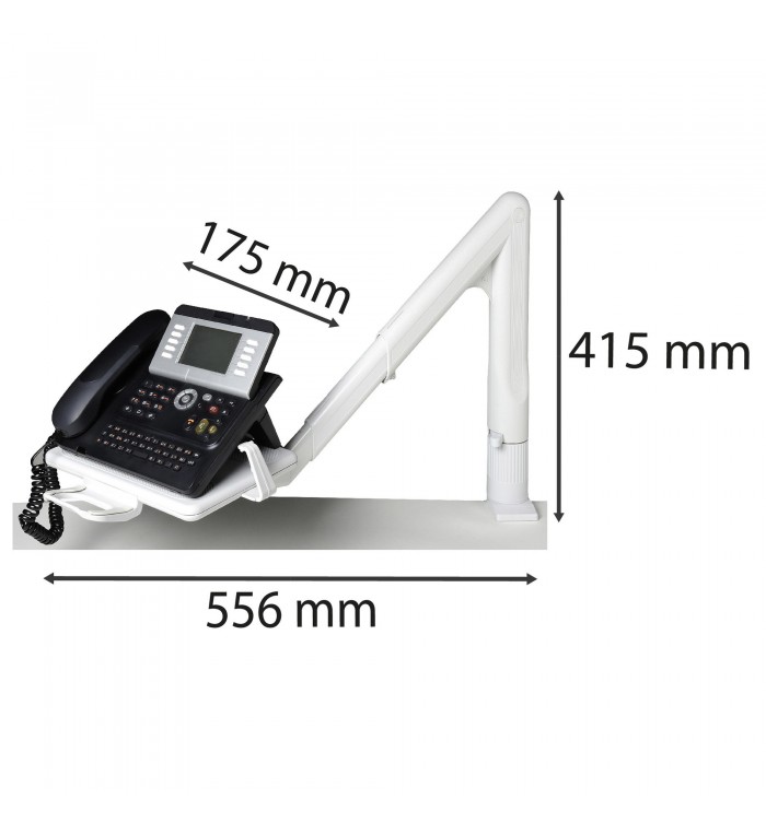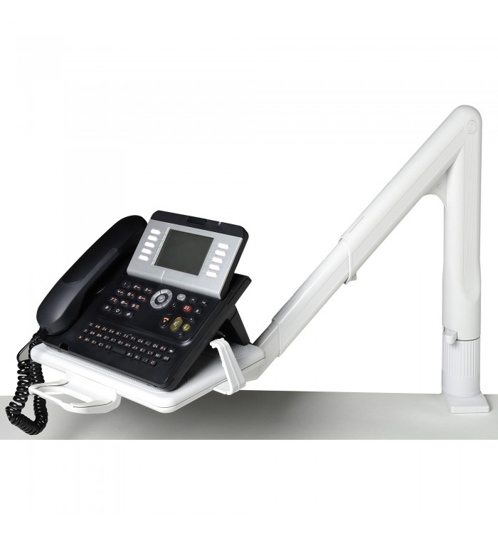 La colonne pivote à 360° de même que le plateau rigide et le bras est téléscopique pour un positionnement parfait du poste téléphonique. Il y a un frein progressif à dureté reglable.