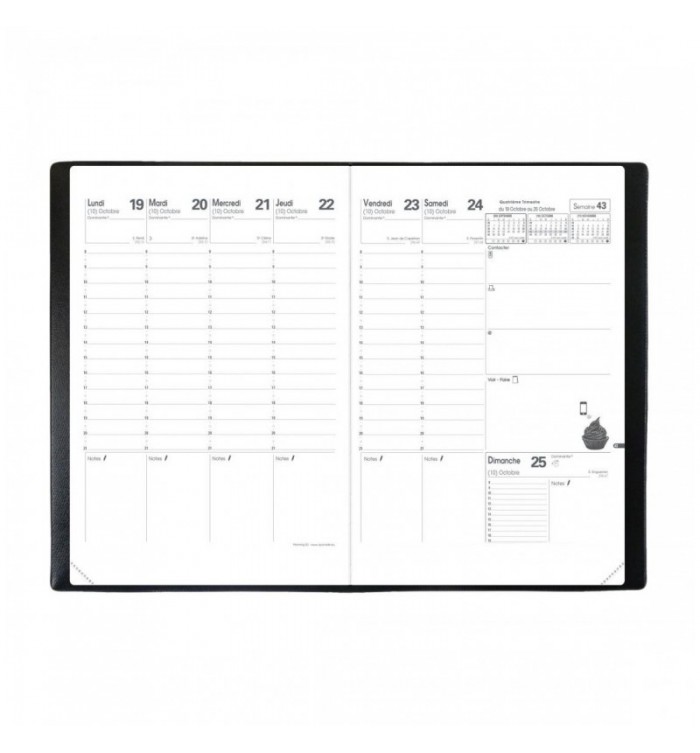 Agenda hebdomadaire avec présentation de la semaine sur 2 pages afin d'offrir une vue d'un seul coup d'oeil.