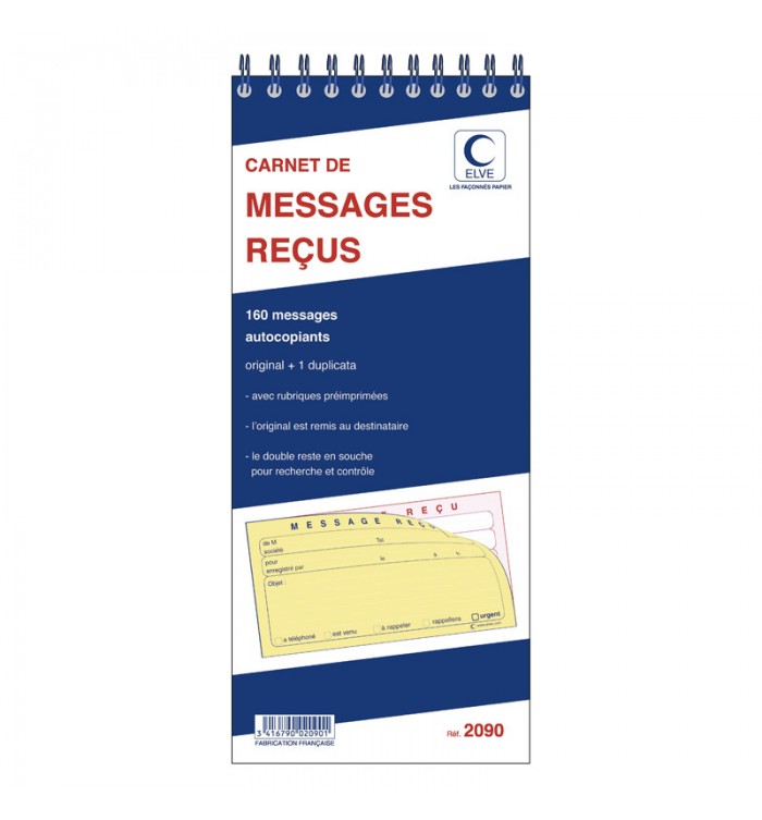 Carnet à spirale de 160 messages autocopiants en 2 exemplaires : un pour le destinataire et l'autre qui reste dans le bloc. Vendu par paquet de 5 carnets. Idéal pour communiquer au travail comme à la maison. Format 322x140mm
