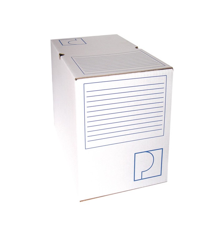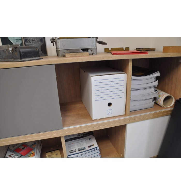 Boîte archive en carton ondulé blanc, rigide et très robuste. Indexation possible sur 3 faces. Dimensions: 250 x 330 mm. Dos de 200 mm.