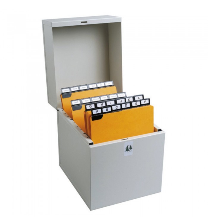 Boîte à fiches en métal, robuste et fonctionnelle.