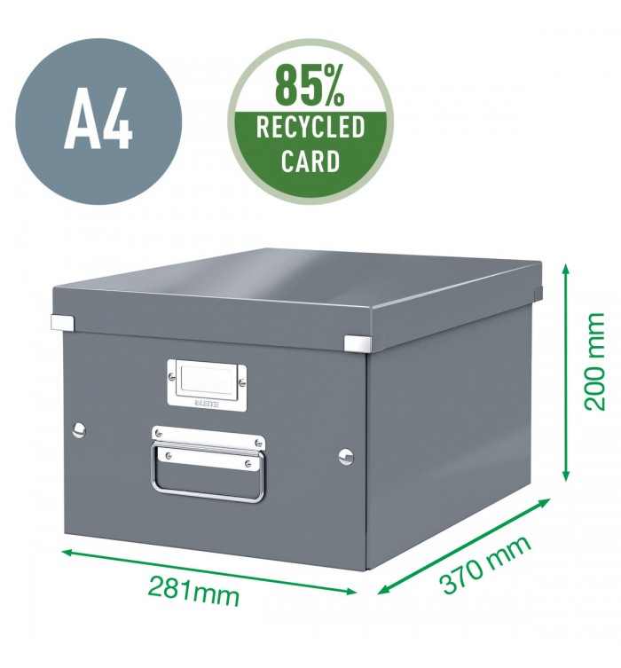 Boîte de rangement et de transport format medium pour documents A4. Fabriqué en carton recyclé post-consommation de première qualité, avec une surface plastifiée et coins en métal pour plus de protection. Poignées en métal pour un transport facile et porte-étiquette pour l'indexation. Repliable pour un rangement peu encombrant lorsqu'il n'est pas utilisé. Design contemporain qui s'adapte parfaitement à la maison et au bureau. Volume de 16 litres.