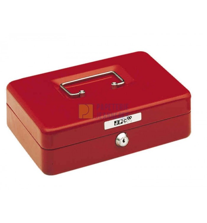 Caisse en acier peinture époxy. Casier à monnaie: compartiment amovible. Serrure à cylindre + 2 clés. Poignée de transport en acier nickelé. Dimensions: 261 x 192 x 81mm. Coloris rouge.