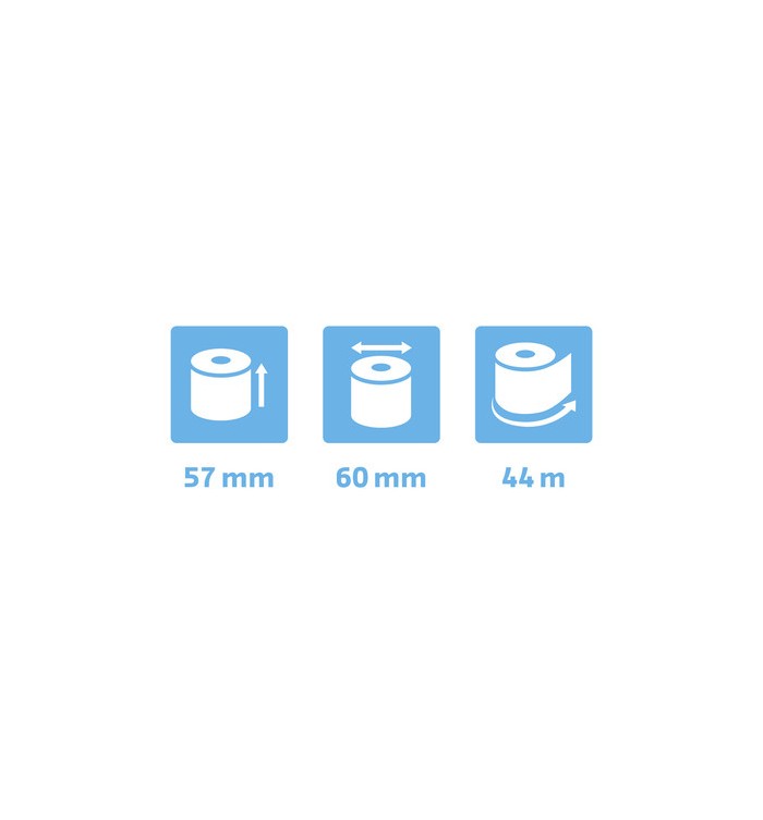Format de la bobine : 57 mm de laize (largeur) et 60 mm de diamètre. Métrage (+ ou - 2 m) : 44 m. Mandrin standard de 12 mm. Convient à toute marque de terminal de paiement ou caisse thermique.