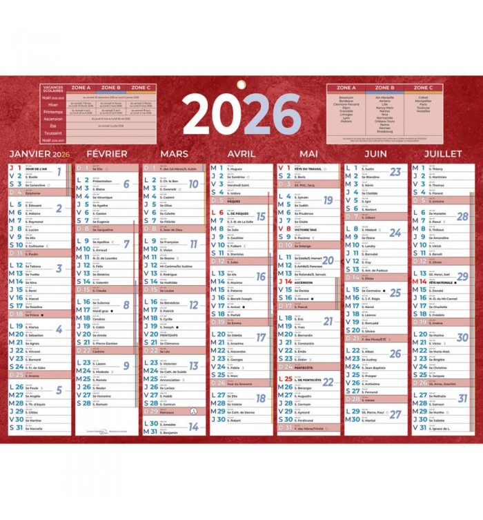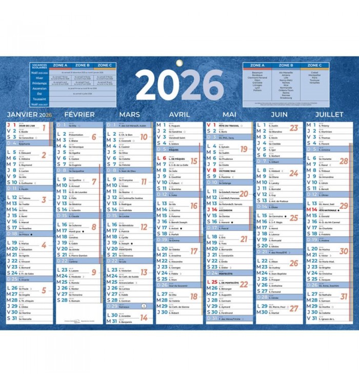 - Inclut les congés scolaires, fêtes, lunaisons, numérotation des semaines, quantièmes, jours ouvrables+