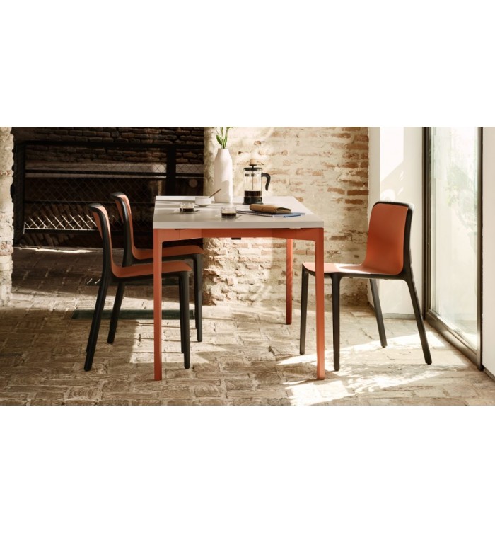 Cadre structurel en polyamide renforcé de fibre de verre, aux formes adoucies, qui supporte et emprisonne la coque assise-dossier en polypropylène (PP), pour une esthétique lisse et avenante de la chaise. 4 butées en polyéthylène sous l’assise permettent d’empiler plusieurs chaises. Patins en élastomère thermoplastique (TPE).