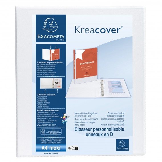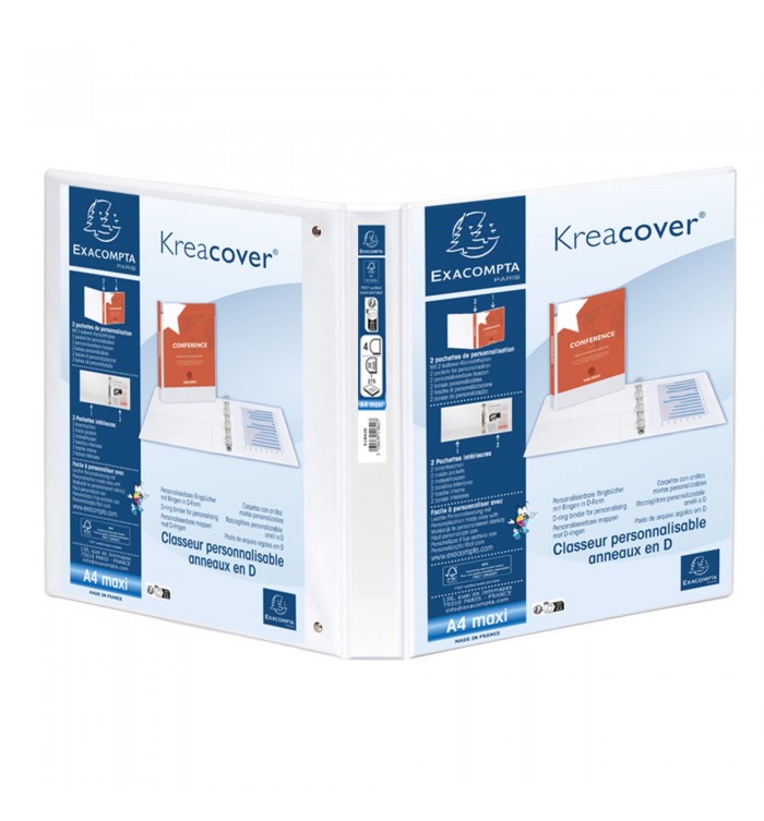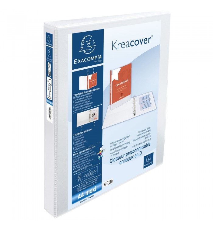 Kreacover®, la gamme de classement qui reflète votre image. Une solution rapide et qualitative pour présenter un dossier personnalisé et facilement modulable. Couverture rigide. 3 pochettes extérieures pour personnaliser la 1ère de couverture, le dos et la 4ème de couverture. 2 pochettes intérieures permettant le maintien des feuilles. Anneaux en D pour un alignement parfait des feuilles et des intercalaires. Qualité supérieure pour une utilisation intensive. Grâce à son format A4 maxi, il s'adapte à tout type de documents.