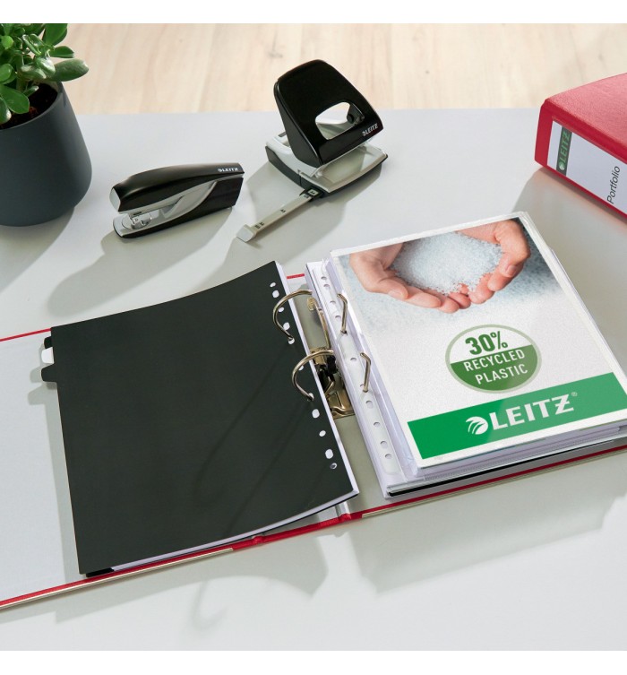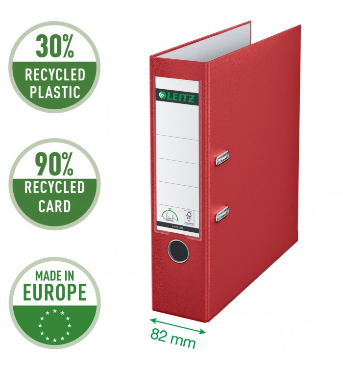 Classeur à levier de haute qualité, pour un usage professionnel. Matériaux durables et mécanisme 180° breveté, pour une performance et une efficacité supérieures. Couverture très résistante fabriquée à partir d'un film PP recyclé à 30% pré-consommation et d'une feuille plastifiée PE à l'intérieur, sur un carton robuste recyclé à 90% post-consommation, pour une meilleure durabilité.