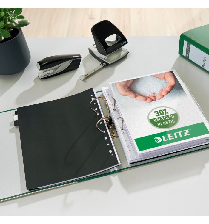 Classeur à levier de haute qualité, pour un usage professionnel. Matériaux durables et mécanisme 180° breveté, pour une performance et une efficacité supérieures. Couverture très résistante fabriquée à partir d'un film PP recyclé à 30% pré-consommation et d'une feuille plastifiée PE à l'intérieur, sur un carton robuste recyclé à 90% post-consommation, pour une meilleure durabilité.
