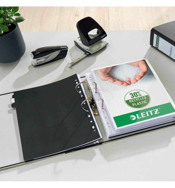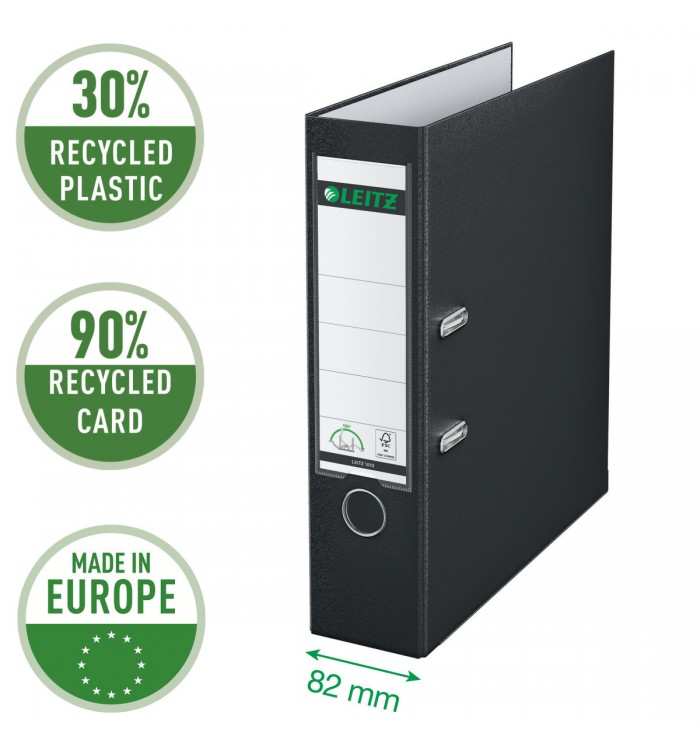 Classeur à levier de haute qualité, pour un usage professionnel. Matériaux durables et mécanisme 180° breveté, pour une performance et une efficacité supérieures. Couverture très résistante fabriquée à partir d'un film PP recyclé à 30% pré-consommation et d'une feuille plastifiée PE à l'intérieur, sur un carton robuste recyclé à 90% post-consommation, pour une meilleure durabilité.
