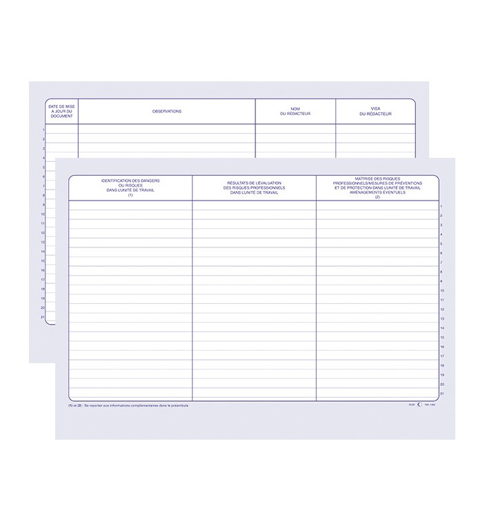 Registre des résultats de l'évaluation des risques professionnels (ERP) à couverture souple avec espace pour indiquer le nom de l'établissement et la durée d'utilisation du registre. Impression encre bleue sur papier offset 100g/m2. Comporte 29 tableaux ouverts foliotés. Conforme au décret n°2001-1016 du 5 novembre 2001. Liste chronologiquement les risques identifiés sur le lieu de travail en ce qui concerne les procédés de fabrication, équipements de travail, substances chimiques, aménagement du lieu de travail et des installations et les actions, mesures de prévention ou décisions d'aménagement subséquentes.