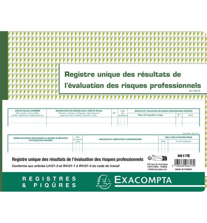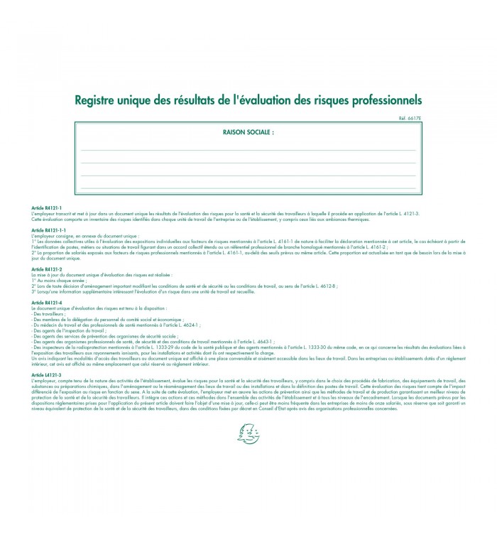 Piqûre 24x32cm - Registre unique des résultats de l'évaluation des risques professionnels - 60 pages