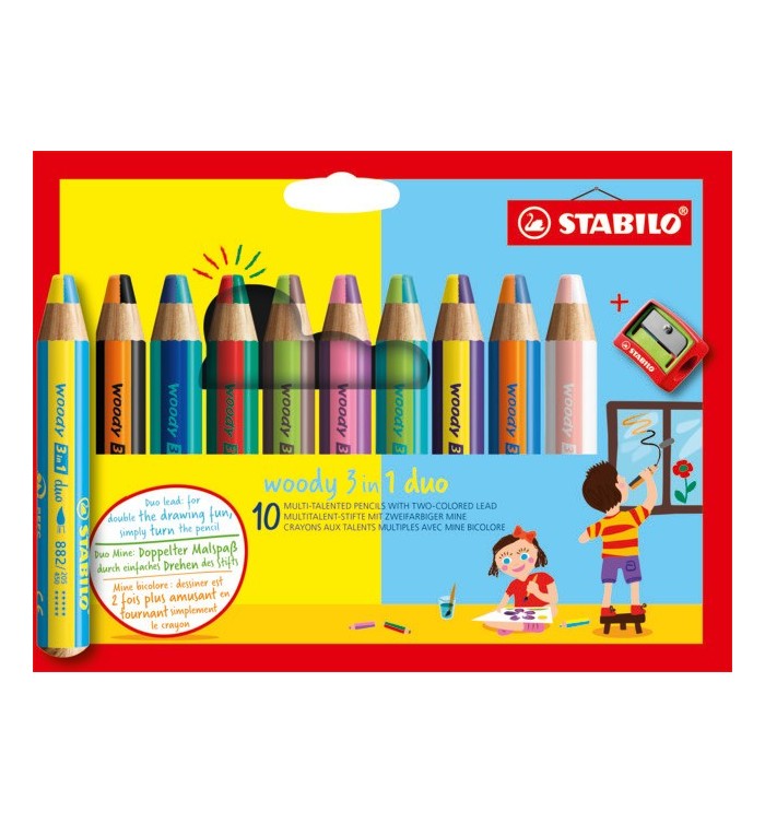 STABILO woody 3 in 1 duo en étui carton de 10 crayons multi-talents + 1 taille-crayon.