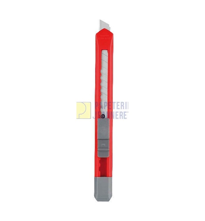 Cutter plastique économique avec curseur de sécurité blocage de lame. Clip d'attache. Encoche casse lame usagée. Lame de 9 mm.
