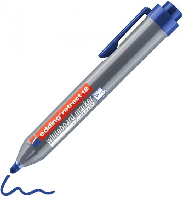 Comment ouvrir d'une main le capuchon d'un marqueur tout en tendant une règle vers un tableau blanc de l'autre main ? La réponse est simple : vous n'avez pas besoin de l'ouvrir ! Ce marqueur spécial pour tableaux blancs EDDING 12 est doté d'un système rétractable pouvant être actionné d'une seule main, comme pour un stylo à bille. La pointe ogive apparaît seulement après avoir appuyé sur le bouton. Mais ce n'est pas tout, l'encre peut être facilement effacée à sec sur n'importe quel tableau blanc sans laisser de traces.