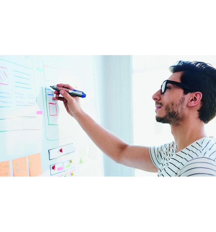 Comment ouvrir d'une main le capuchon d'un marqueur tout en tendant une règle vers un tableau blanc de l'autre main ? La réponse est simple : vous n'avez pas besoin de l'ouvrir ! Ce marqueur spécial pour tableaux blancs EDDING 12 est doté d'un système rétractable pouvant être actionné d'une seule main, comme pour un stylo à bille. La pointe ogive apparaît seulement après avoir appuyé sur le bouton. Mais ce n'est pas tout, l'encre peut être facilement effacée à sec sur n'importe quel tableau blanc sans laisser de traces.