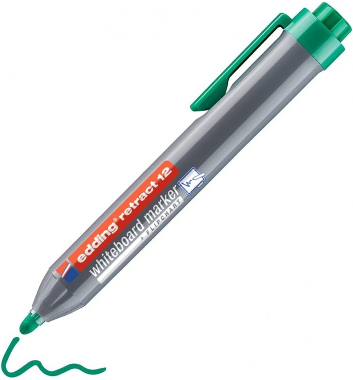 Comment ouvrir d'une main le capuchon d'un marqueur tout en tendant une règle vers un tableau blanc de l'autre main ? La réponse est simple : vous n'avez pas besoin de l'ouvrir ! Ce marqueur spécial pour tableaux blancs EDDING 12 est doté d'un système rétractable pouvant être actionné d'une seule main, comme pour un stylo à bille. La pointe ogive apparaît seulement après avoir appuyé sur le bouton. Mais ce n'est pas tout, l'encre peut être facilement effacée à sec sur n'importe quel tableau blanc sans laisser de traces.