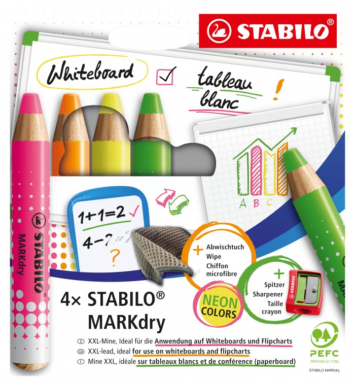 CRAYON EFFACABLE A SEC WHITEBOARD DRY STABILO - POCH. 4 ASS. FLUO