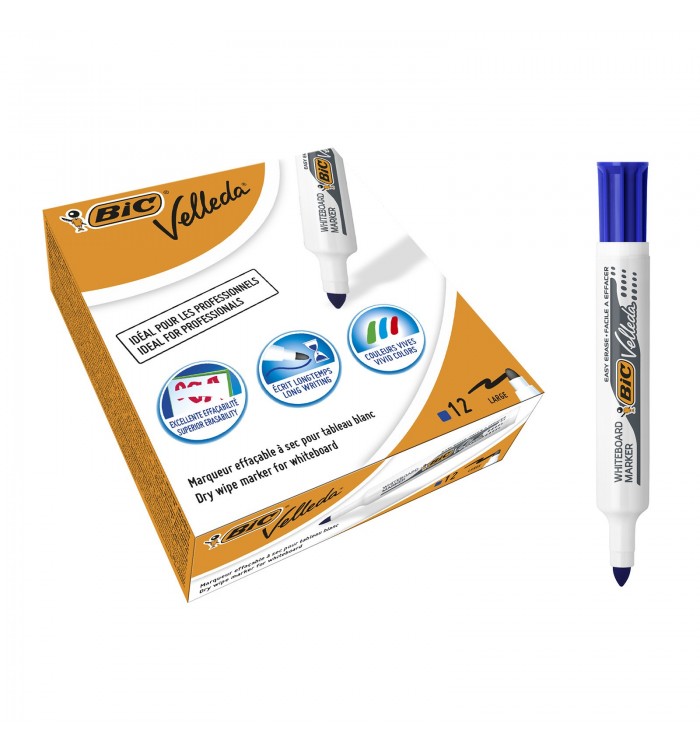 Feutres effaçables à sec BIC Velleda 1711. Parfaits pour un usage professionnel, leur encre bleue s'efface à sec très facilement, sans laisser de résidus même après plusieurs jours. Leur pointe ogive de 0,6 mm permet une épaisseur de trait de 1,9 mm, pour écrire clairement et effectuer des schémas précis.