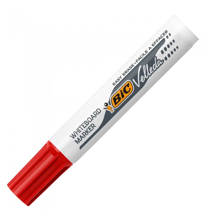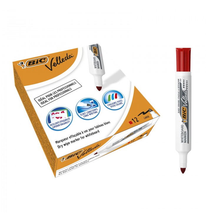 Feutres effaçables à sec BIC Velleda 1711. Parfaits pour un usage professionnel, leur encre rouge s'efface à sec très facilement, sans laisser de résidus même après plusieurs jours. Leur pointe ogive de 0,6 mm permet une épaisseur de trait de 1,9 mm, pour écrire clairement et effectuer des schémas précis.