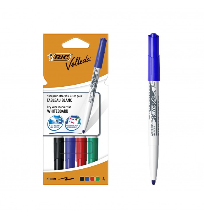 - Ces 4 marqueurs Velleda 1741 de BIC ont une pointe moyenne (4,5 mm de diamètre), pour un tracé épais de 1,4 mm