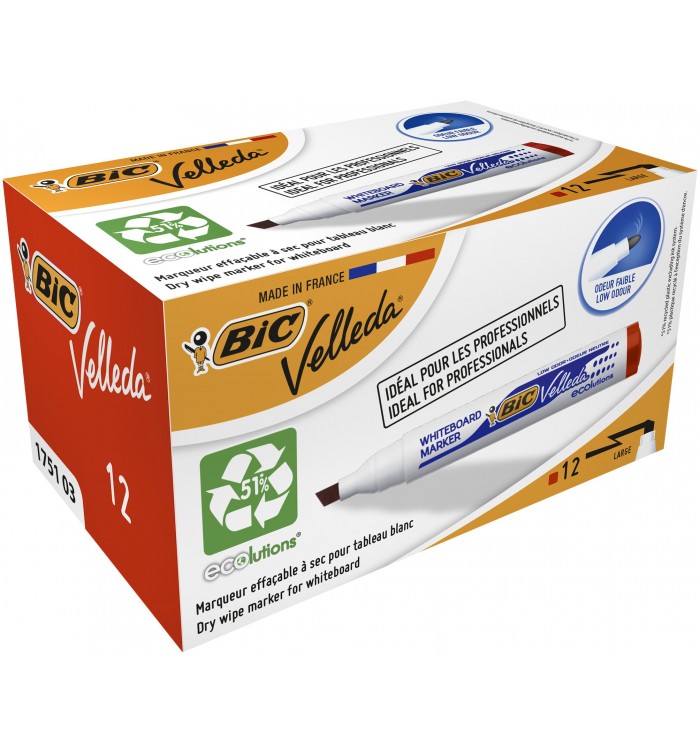 - Idéal pour les professionnels, le feutre effaçable BIC Velleda 1751 ECOlutions présente les informations avec clarté et style