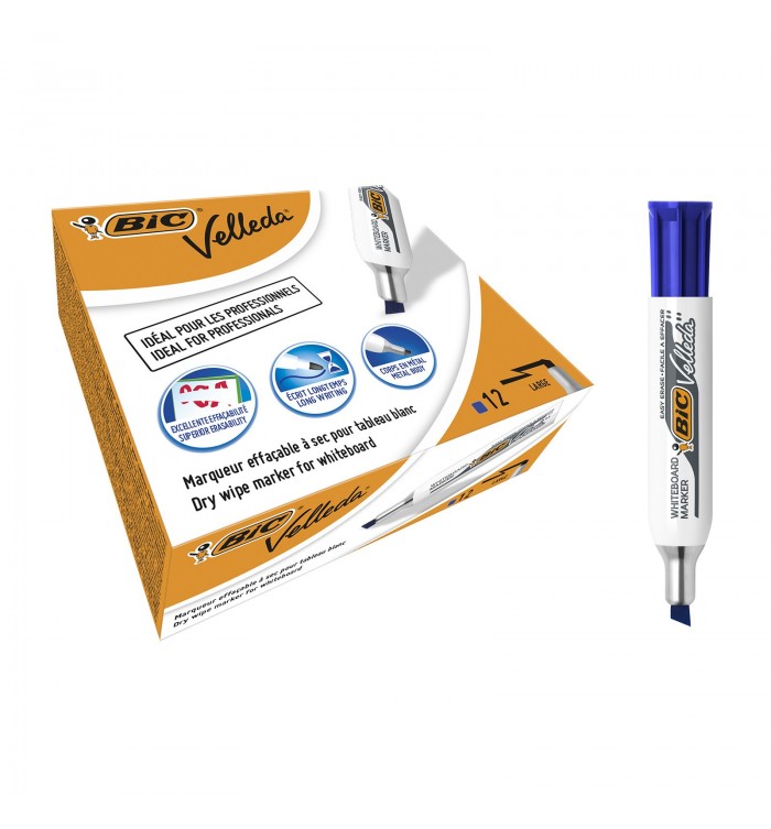 Le feutre effaçable pour tableaux blancs BIC Velleda 1781 est particulièrement adapté aux professionnels et aux enseignants. Ses 6 couleurs d'encre vives (noir, bleu, rouge, vert, orange, et turquoise) permettent une écriture bien visible et des présentations impactantes. Si vous vous trompez, pas de panique, car ce marqueur s'effaçe à sec très facilement. Avouez que c'est bien pratique. Son corps large en métal étanche conserve parfaitement la qualité de l'encre. Sa pointe biseautée permet de faire varier la largeur du tracé selon vos envies, pour un trait compris entre 3,3 mm et 4,6 mm en moyenne. La pointe est bloquée, et ne se courbe ni se rétracte à la pression sur les tableaux blancs. Depuis les années 1950, la marque BIC fabrique des instruments d'écriture de qualité au meilleur prix. Sa marque BIC Velleda est spécialisée dans les marqueurs effaçables à sec et les tableaux blancs.