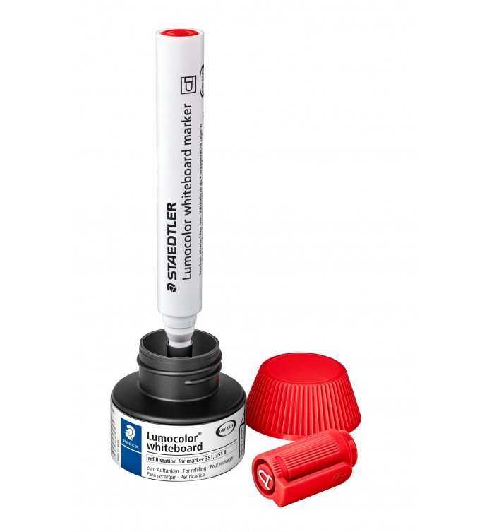 Flacon recharge pratique en polypropylène pour recharger facilement et proprement les marqueurs Lumocolor whiteboard marker 351 / 351 B : insérer simplement le marqueur dans le flacon, quelques minutes plus tard le marqueur est prêt à l’emploi et après 3 à 4 heures, il est complètement rechargé