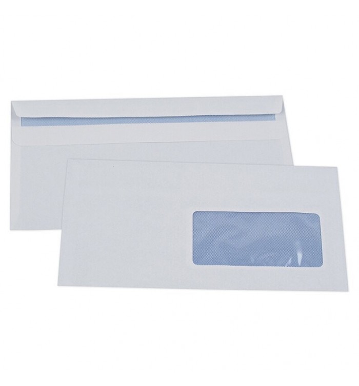 500 enveloppes blanches format DL 110 x 220mm 80g autocollante, fenêtre à droite 45x100mm.