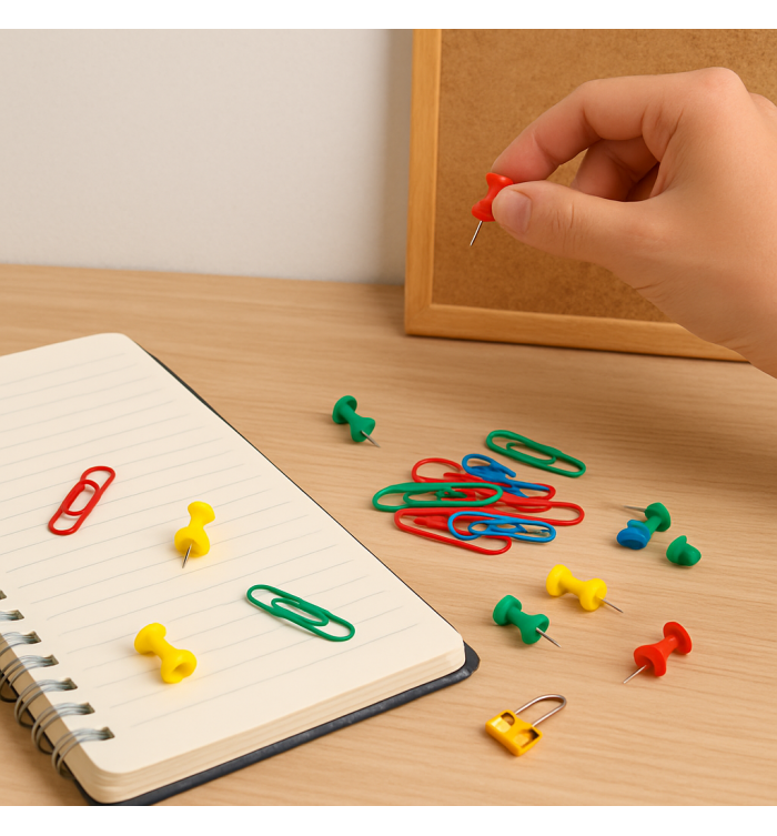 - 6 Types de Fixations : Trombones (25 mm et 50 mm), punaises, push pins, pinces double clip, élastiques en caoutchouc.