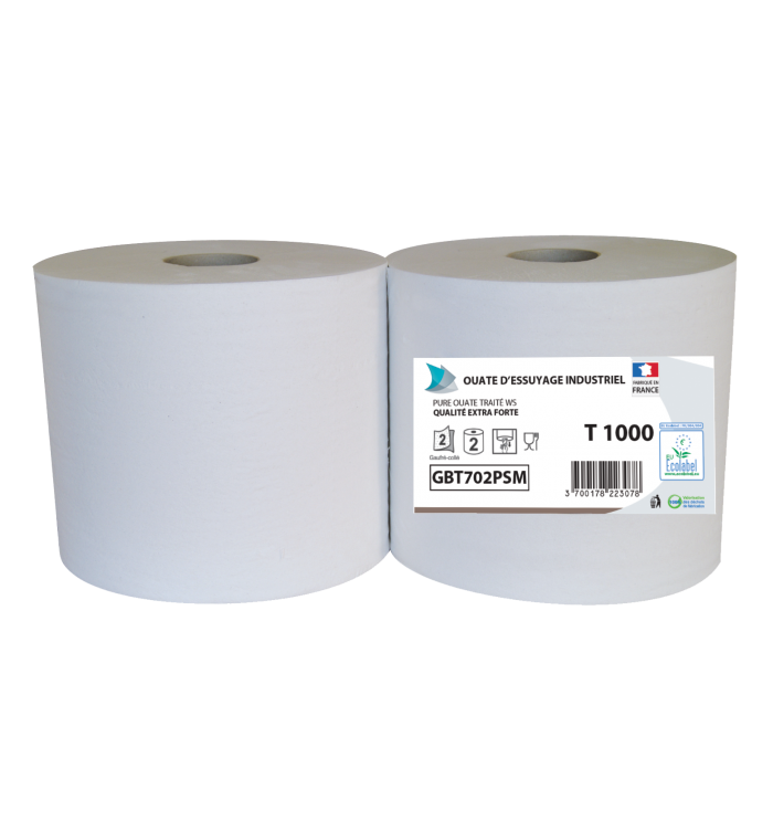 Paquet de 2 bobines d'essuyage industriel. Ouate blanche 2 x 20g/m². Bobine de 1000 formats 21,5x35 cm.