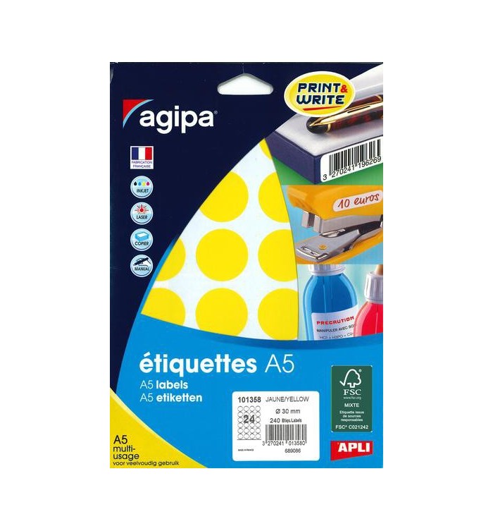 ETIQUETTES AUTOCOLLANTES DIAM 30mm JAUNES - PAQUET DE 240