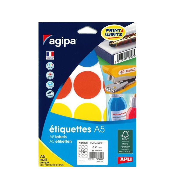 ETIQUETTES AUTOCOLLANTES DIAM 45mm COLORIS ASSORTIS - SACHET DE 84