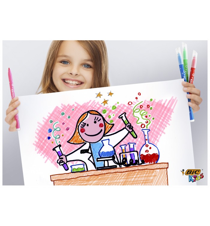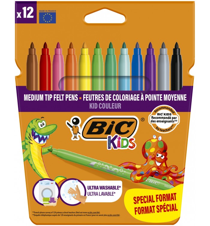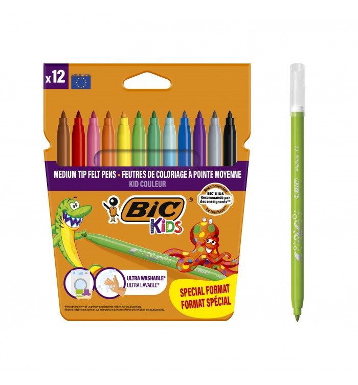 La gamme BIC Kids propose des instruments de coloriage spécialement conçus pour le développement, le confort et la sécurité des enfants. Parfaits pour le coloriage quotidien des enfants dès 5 ans, les feutres Kid Couleur ont plus d'une corde à leur arc. Déclinés en 24 couleurs lumineuses, ils permettent des dessins vifs et riches en contrastes. Leur pointe moyenne bloquée ne s'enfonce pas à la pression sur le papier. Ils sont donc adaptés à une longue utilisation alternant contours précis et coloriages intensifs. Pas de panique en cas de petite bêtise, ces feutres de coloriage sont ultra lavables. Les feutres Kid Couleur sont solides et fiables : ils sont fabriqués en France dans les usines de l'entreprise BIC avec un savoir faire unique. Merci qui ? Les feutres Kid Couleur bien sûr.