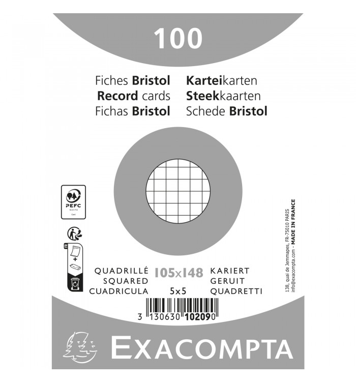 Paquet 100 fiches sous film - bristol quadrillé 5x5 non perforé 105x148mm Blanc