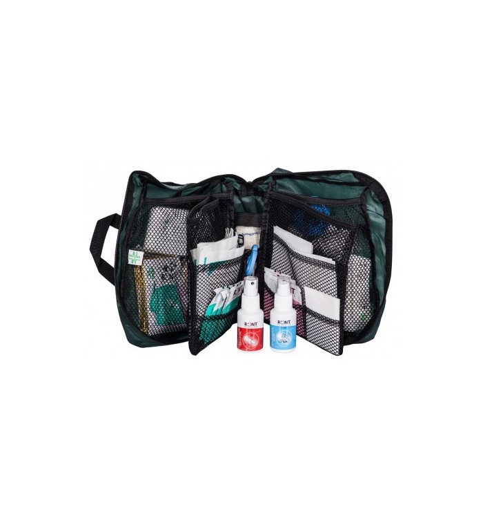 Spécial "écoles & centres aérés". Trousse de secours en tissus fermeture par zip. 2 sacoches et 6 compartiements. Contient 77 éléments. Poids : 360g. Dimensions : 200x150x80 mm.