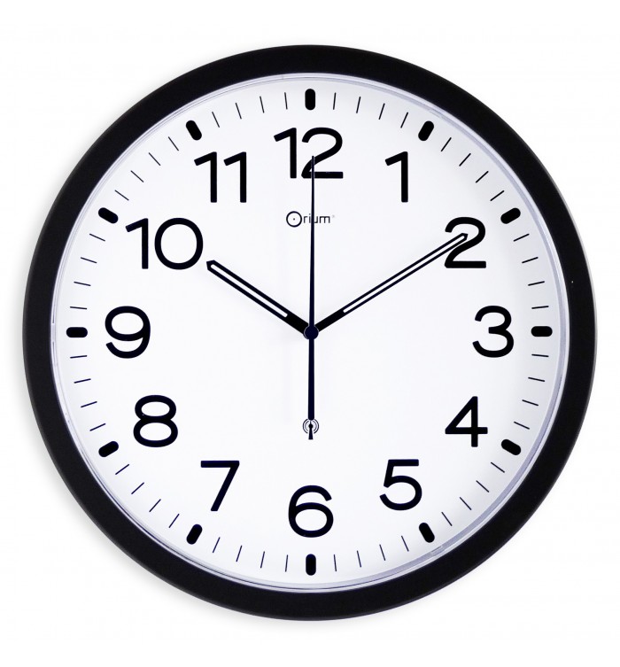 Horloge murale à quartz. Chiffres géants pour une lecture directe. Boîtier en A.B.S. Livrée sans pile. Diam. 30 cm