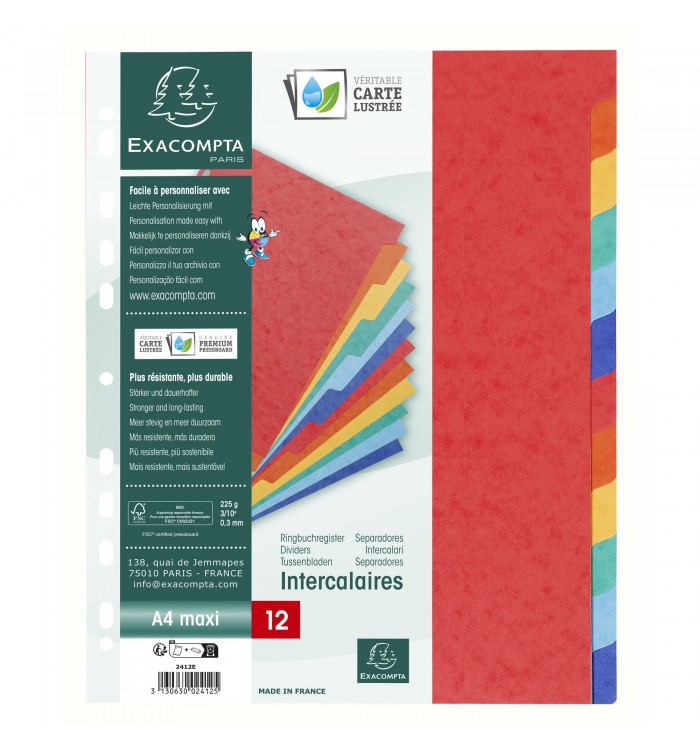 Intercalaires en véritable carte lustrée souple 225g/m2 FSC® avec 12 onglets neutres Couleurs assorties