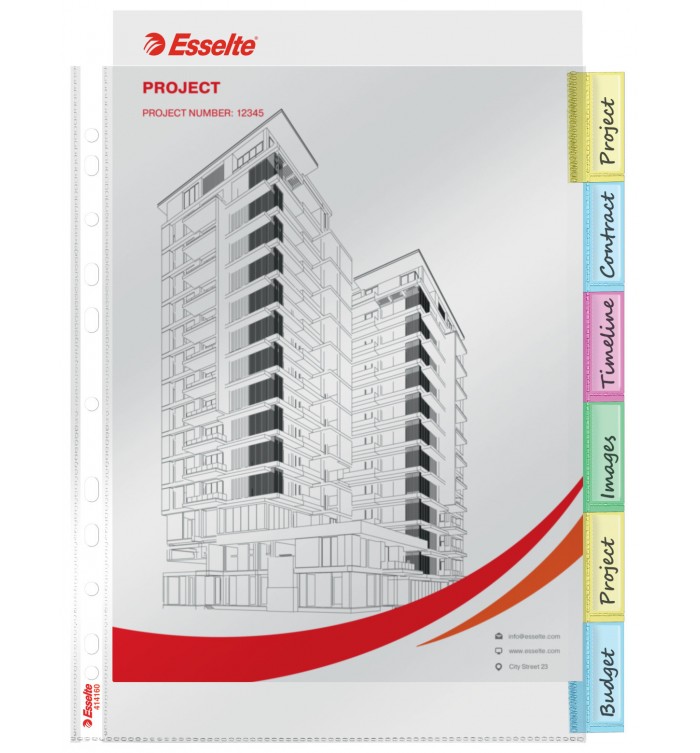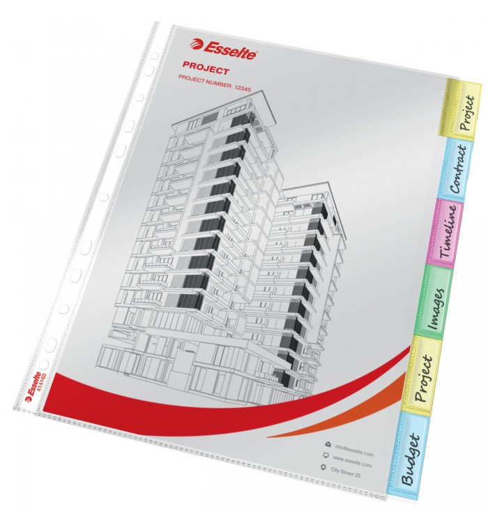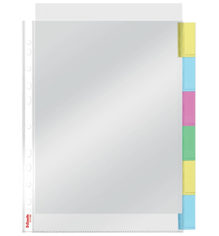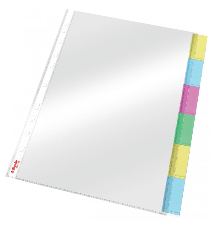 6 pochettes-intercalaire de couleur, finition transparente, idéal pour un usage quotidien à la maison, au bureau ou à l'école. La bande renforcée perforée à 11 trous permet de ranger facilement les documents dans des classeurs, en les protégeant de l'humidité, de la poussière et de la saleté. S'ouvre sur le dessus pour faciliter l'accès aux documents sans débloquer le mécanisme du classeur. Le matériau résistant à la copie et sans acide assure une protection à long terme des documents. Fabriqué en plastique PP (polypropylène), 100% recyclable.