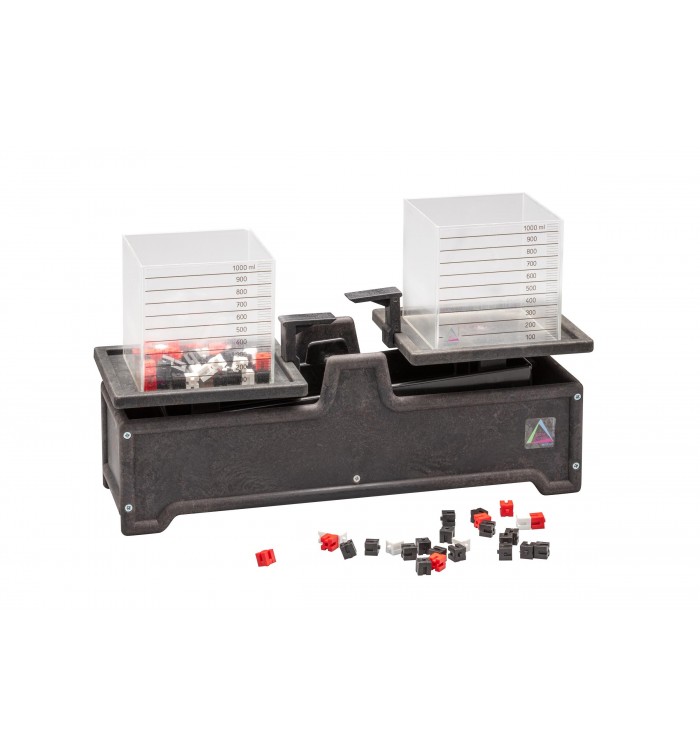 Pesage 0.5 à 2000g - taille assiette 13x13 cm - en RE-WOOD - réglage manuellement - tolérance de pesée +/- 0.5g - 2 boîtes transparentes graduées - 10 cubes de poids colorés (1g chacun).