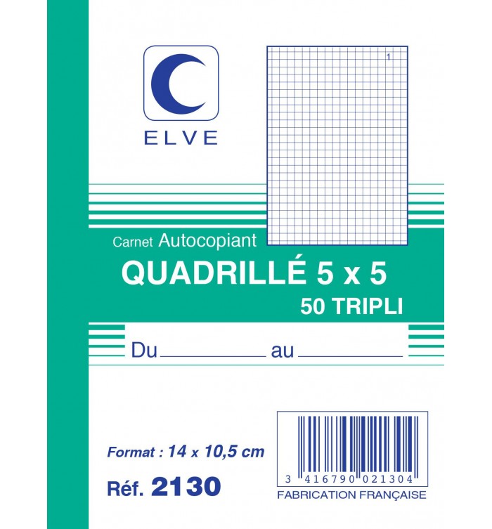Carnet autocopiant "quadrillé 5/5", 50 feuillets numérotés en tripli. Premier feuillet CB 56g/m2 avec impression encre bleue; deuxième feuillet CFB 53g/m2 avec impression encre rouge; troisième feuillet CF 57g/m2 avec impression encre verte. Format 140x105 mm (A6).