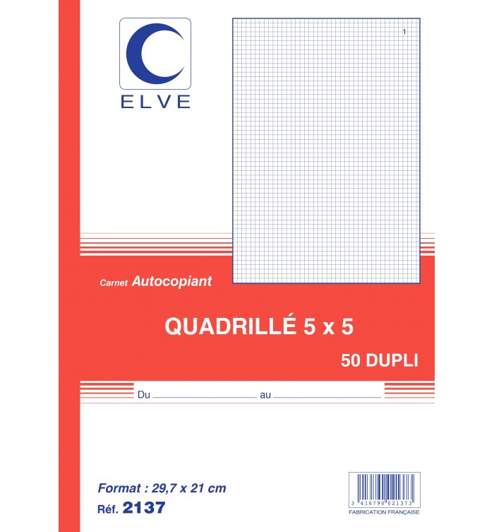 Carnet autocopiant "quadrillé 5/5", 50 feuillets numérotés en dupli. Premier feuillet CB 56g/m2 avec impression encre bleue; deuxième feuillet CF 57g/m2 avec impression encre rouge. Format 297x210mm (A4)