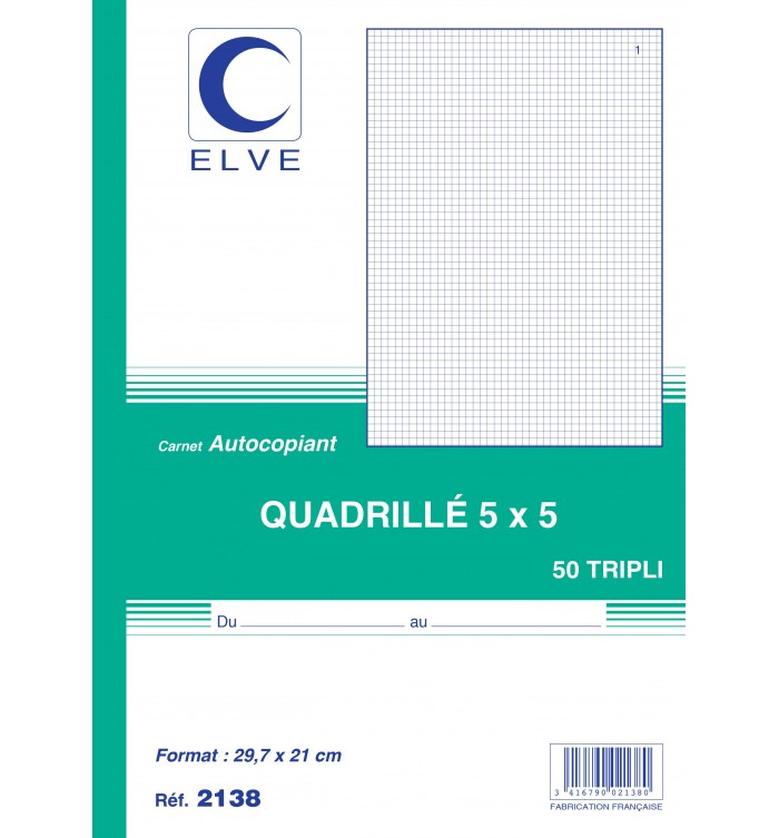 Carnet autocopiant "quadrillé 5/5", 50 feuillets numérotés en tripli. Premier feuillet CB 56g/m2 avec impression encre bleue; deuxième feuillet CFB 53g/m2 avec impression encre rouge; troisième feuillet CF 57g/m2 avec impression encre verte. Format 297x210mm (A4)