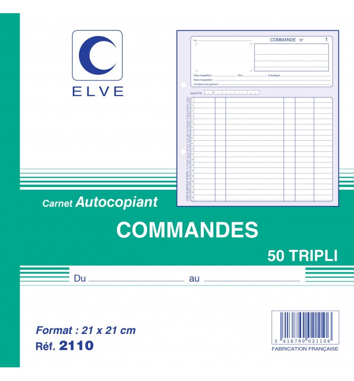 Carnet autocopiant "commandes", 50 feuillets numérotés en tripli. Premier feuillet CB 56g/m2 avec impression encre bleue; deuxième feuillet CFB 53g/m2 avec impression encre rouge; troisième feuillet CF 57g/m2 avec impression encre verte. Format 210x210mm