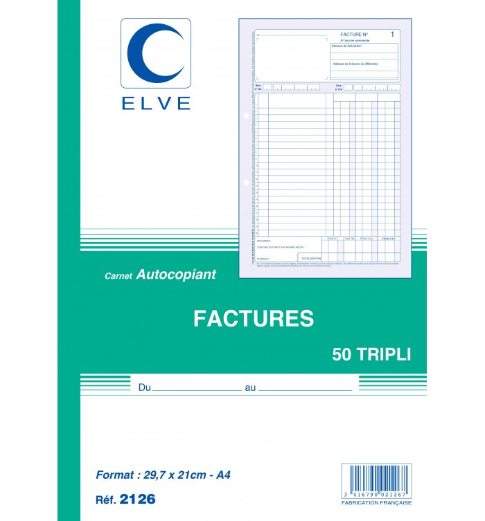 Carnet autocopiant "factures", 50 feuillets numérotés en tripli. Premier feuillet CB 56g/m2 avec impression encre bleue; deuxième feuillet CFB 53g/m2 avec impression encre rouge; troisième feuillet CF 57g/m2 avec impression encre verte - CONFORME A LA LEGISLATION EN VIGUEUR. Format 297x210 (A4)