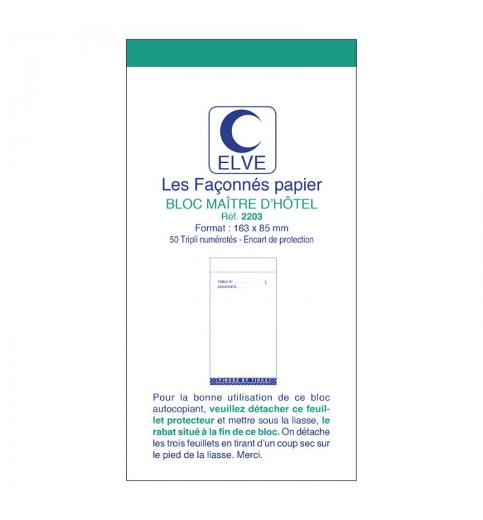 10 carnets autocopiants "maître d'hôtel" de 50 liasses numérotées détachables en 3 exemplaires. Le dos en carton rigide avec rabat permet une écriture facile. S'utilise sans porte-bloc. Vendu par paquet de 10 blocs. Idéal pour la prise de commande dans les cafés, hôtels et restaurants.