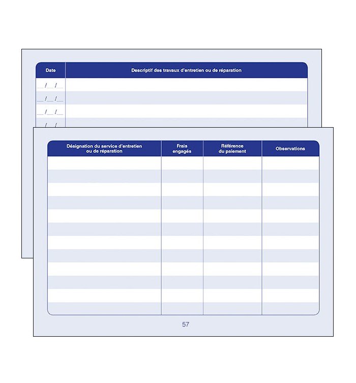 Carnet de bord pour véhicules de service combinant suivi kilométrique, nom du conducteur et suivi des opérations de maintenance.