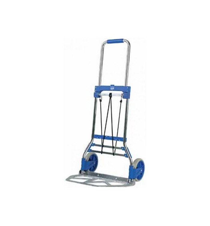 Diable pliant aluminium de coloris bleu. 2 roues plastiques Ø 190 mm. Charge utile 90 Kg. Dim. déplié 520 x 485 x 1080 - Poids. 3,3 kg