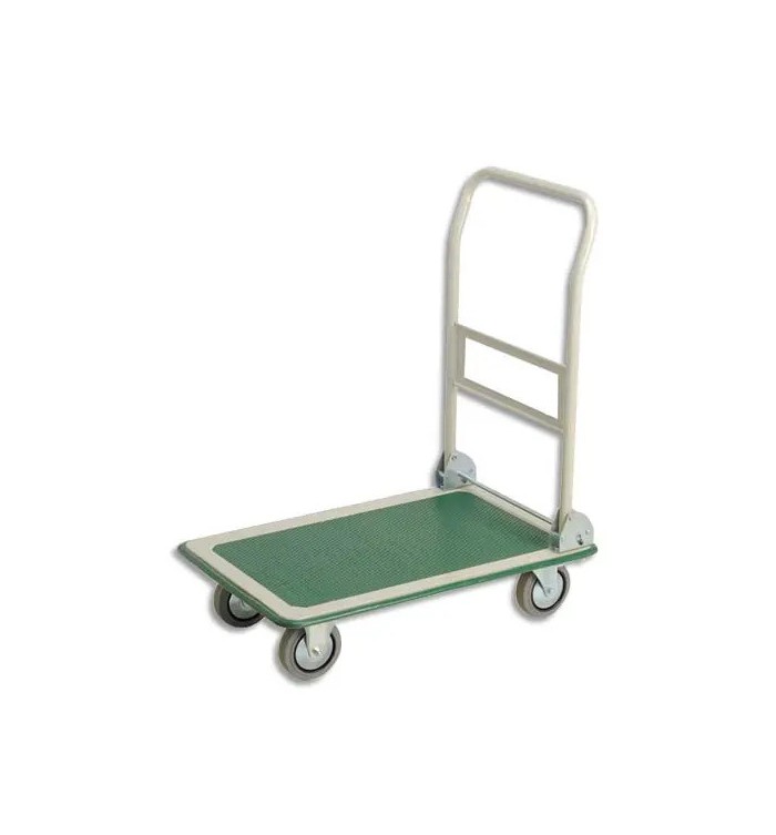 Chariot pliable La référence! Poignée en tube acier peint repliable et blocable, déverrouillage au pied. Plateau en acier embouti renforcé avec revêtement antidérapant. Pare-chocs de sécurité. Equipé de 4 roulettes silencieuses dont deux pivotantes, Ø 12,5 cm, bandage résiprène. Dimensions déplié (l x h x p) : 74,5 x 86 x 48 cm. Dimensions plié (l x h x p) : 74,5 x 23,5 x 48 cm. Poids : 12 kg. Produit éco-responsable : • Recyclable à 95%