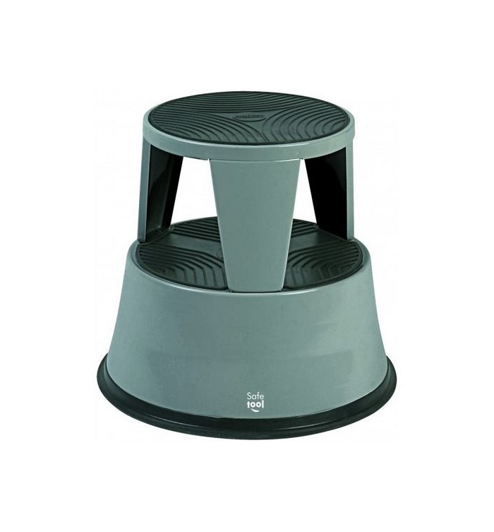 Tabouret roulant métal. 2 marches avec revêtement antidérapant. 3 roues escamotables et pivotantes. Pare-choc caoutchouc. Charge utile 150 kg